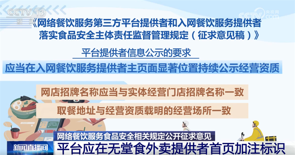 记者16日从市场监管总局领会到,为进一步加强收集餐饮办事食物平安监管,《收集餐饮办事第三方平台供给者和入网餐饮办事供给者落实食物平安从体义务监视办理(收罗看法稿)》面向社会公开收罗看法。这份办理收罗看法稿有哪些亮点?一路来领会。收罗看法稿明白了平台供给者收集餐饮办事食物平安从体义务,要求对入网餐饮办事供给者的运营天分、加工制做、卫生等进行监测和抽查。每月线下抽查入网餐饮办事供给者的比例不低于百分之五,监测和抽查成果留存备查,留存刻日不得少于2年。平台供给者该当将入网餐饮办事供给者运营天分取省级市场监视办理部分从体天分消息进行校验比对,校验不成功的不得上线运营。