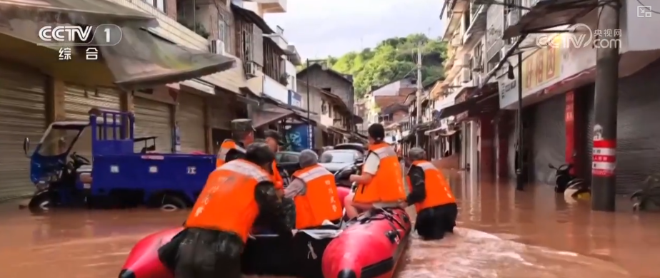 7月9日,四川省泸州市合江县福宝镇受持续降雨影响,有部门街道和衡宇被淹、群众被困,四川总队泸州支队官兵照顾皮划艇等救援器材展开告急救援。